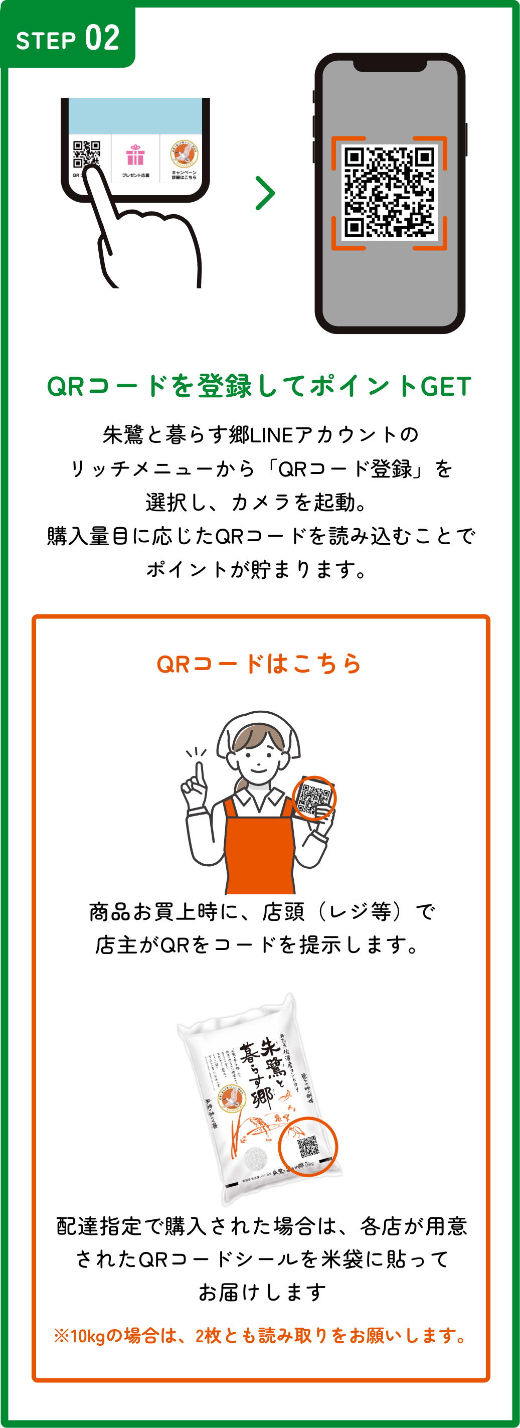 「朱鷺と暮らす郷」推奨店で対象商品をお買い求めの際に提示されるQRコード、または対象商品に貼付されているシールに記載されているQRコードです。このQRコードを読み込むことで、キャンペーンのポイントが貯まります。